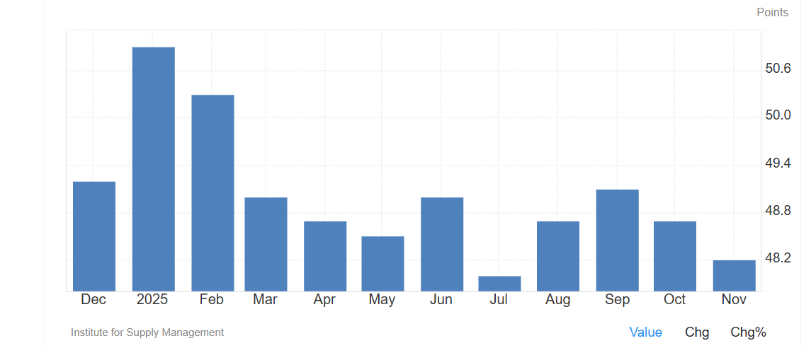 The ISM Manufacturing Report for November 2025 showed continued contraction in the U.S. manufacturing sector, with the PMI dropping to 48.2 (below 50 indicates contraction), marking the ninth straight month of decline and a faster contraction pace than the prior month. Key areas like New Orders and Employment worsened, while Prices Paid rose, signaling weak demand but increasing cost pressures, leading to a mix of contraction and inflation worries. Key Takeaways from the November 2025 Report (Released December 1st, 2025): |