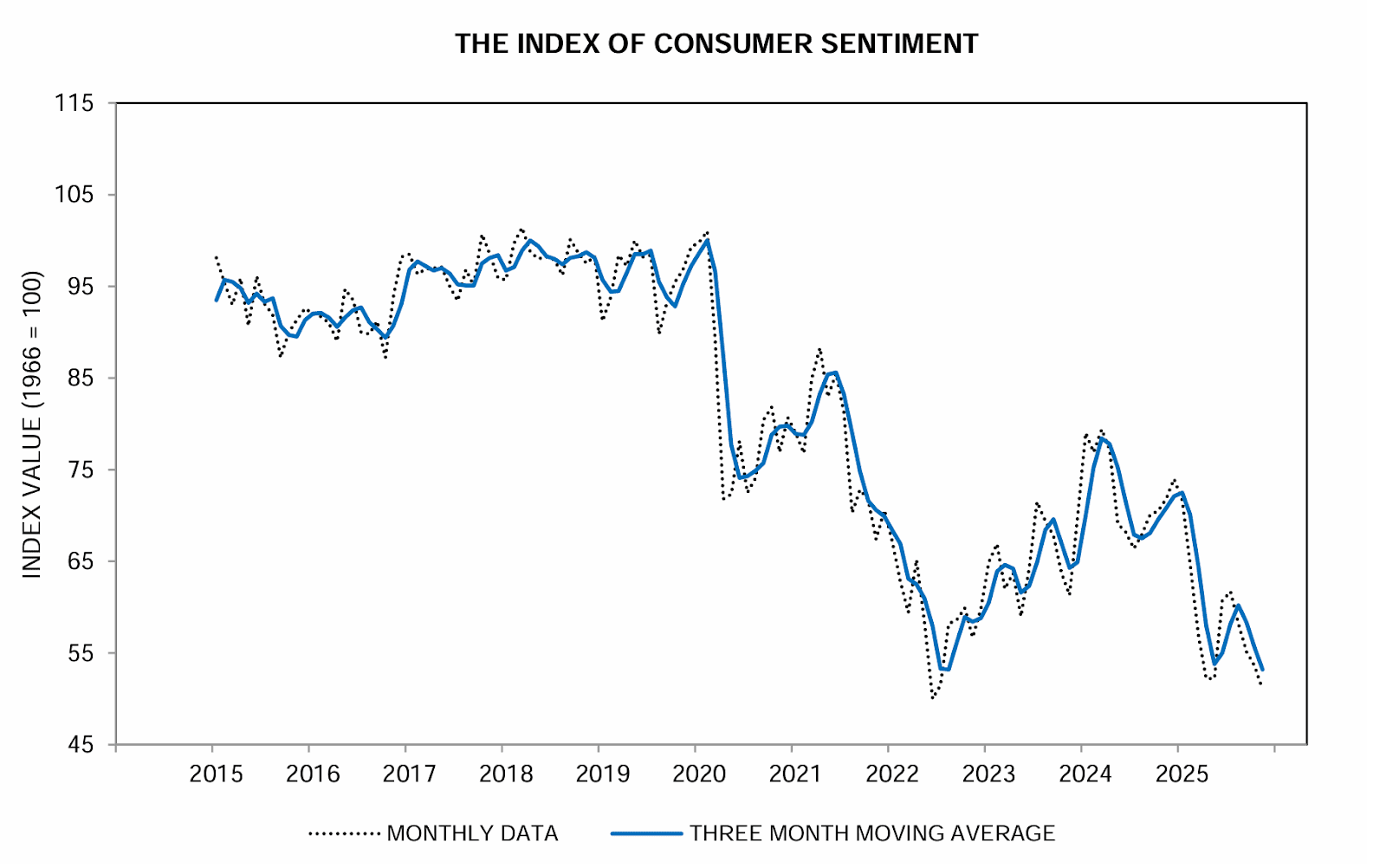 The University of Michigan Consumer Sentiment Index rose slightly to 51.0 in November (from a preliminary 50.3) following the end of the federal shutdown, but the improvement leaves sentiment hovering near historic lows — the second-weakest reading on record. |