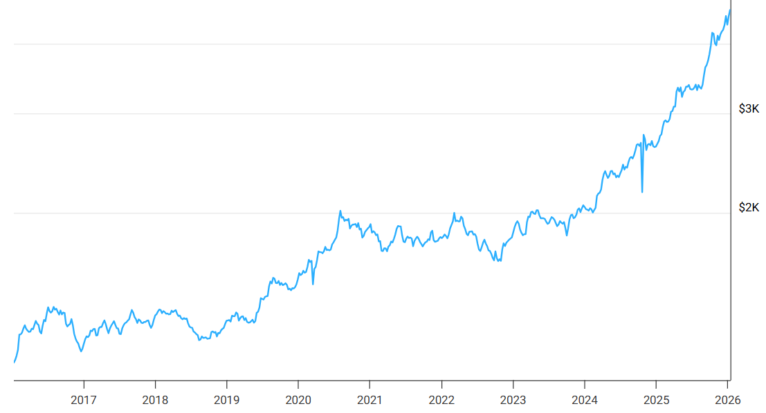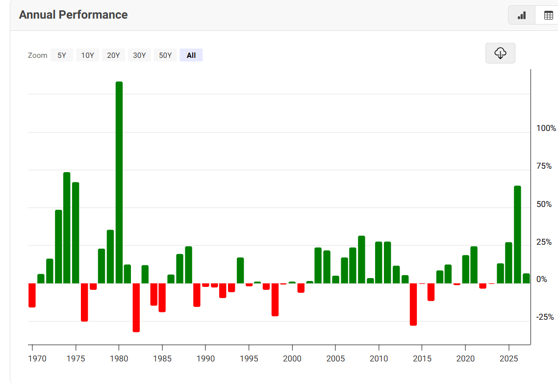 Although the recent run up in gold price is impressive as shown below, the second chart shows annual performance which given the drivers for the current run look set to continue into 2026.