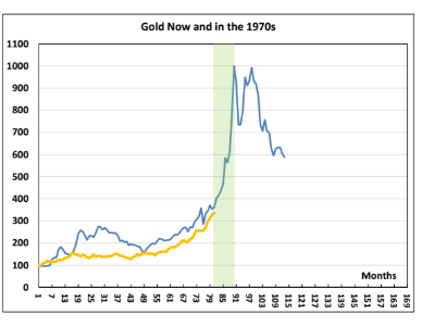 Blue is the Gold rally 1971 to 1980, Gold went from $38 to $ 850 (2,300%), Yellow is current Gold rally which started approximately which started approximately March of 2024 at $2,100 (vs current $4,000) price.